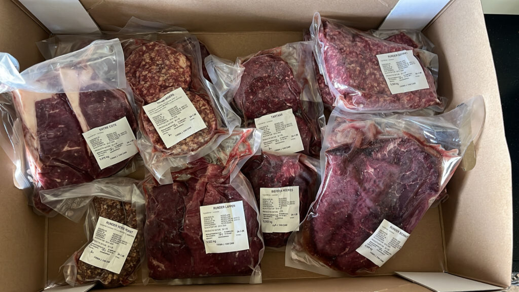 De inhoud kan wisselen, bijvoorbeeld: runder -gehakt, -lappen, -tartaart, biefstuk, -entrecote, -rookworst, -schnitzel en -hamburgers. Gewicht 5 kg, €85,- per pakket.